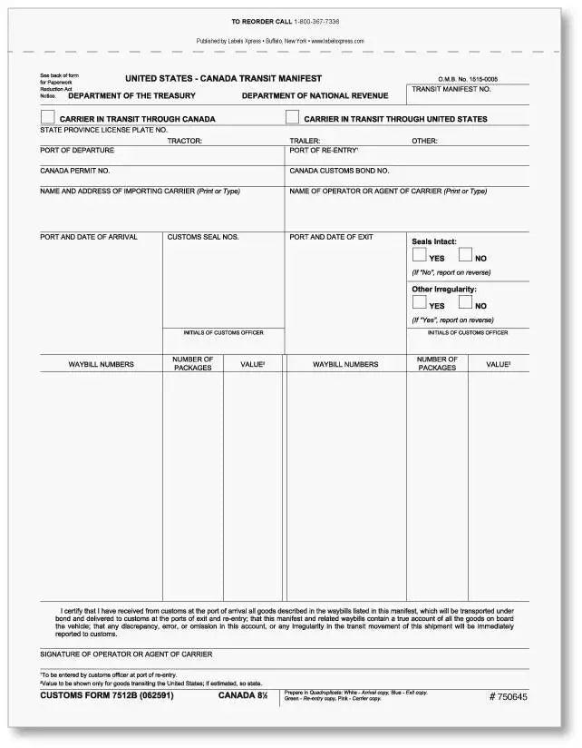 These high-quality documents are your reliable companion for transporting goods through the U.S. or Canada and provide a complete record of your shipment, quantity, value, port of entry, port of exit, and other required info. The official A4 size paper provides ample space for detailed information and easy readability. Comply with regulations and transport your goods with ease using our A8B In-Transit Manifests.